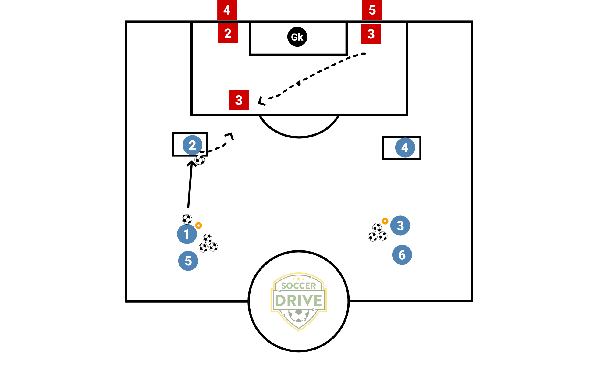 Have defenders setup on each side of the goal, balls are up at the top lines.