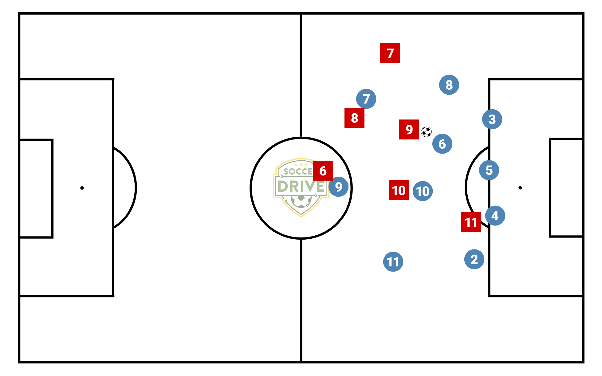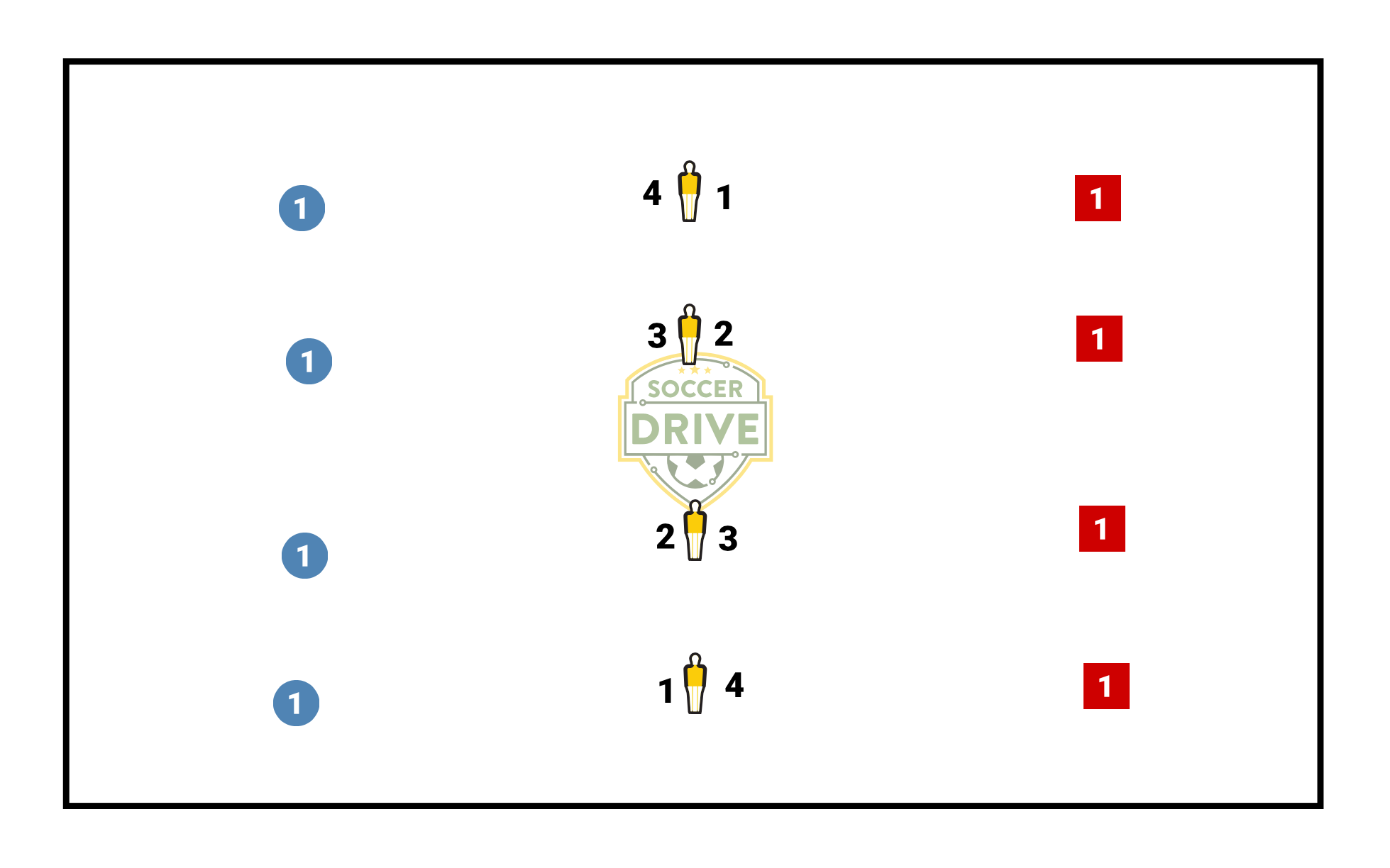 *Pressure: Closest player to the ball - allow no time for the player, force at an angle *Cover: Closest to pressure defender, deny short & easy option. This player will step to the ball when the pressure player is best *Balance: The rest of the players. These players cover the gaps between the pressure and cover defenders Set up 4 (or 3) mannequins/flags and number them. Have 4 (3) players (preferably back line) 5-8 yards away. The coach will call out a number and the players will sprint to the correct numbered mannequin, while keeping the correct defensive shape, showing pressure, cover, and balance. Continue calling different numbers and allowing players to adjust their shape accordingly