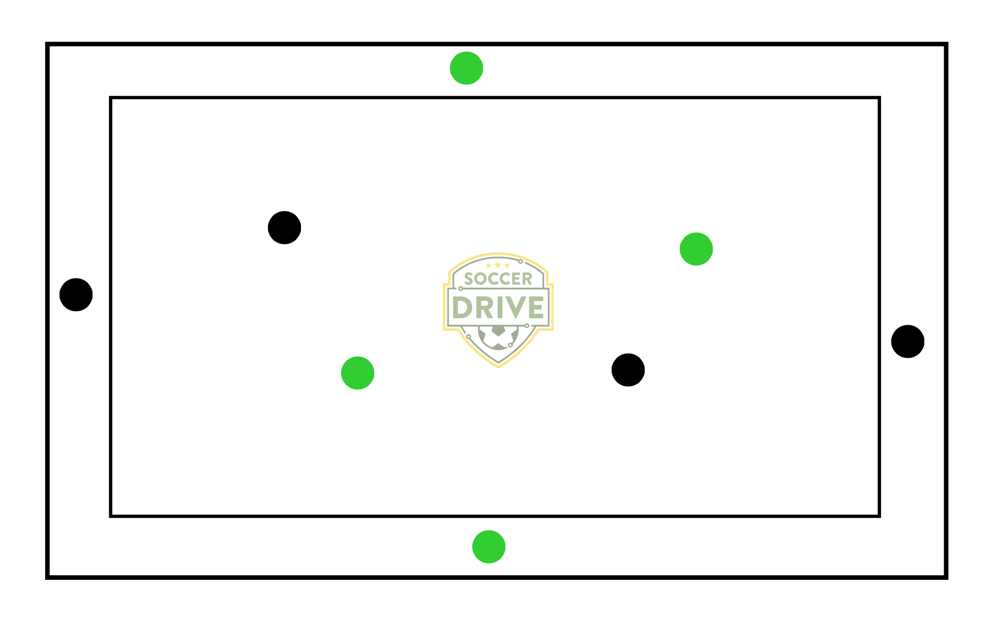 Variation/Progression: After each point, the players must change direction, meaning the outside players have to move to where a black player is until everyone is on a new side. This is all occurring while the players in the middle are trying to maintain possession. A ball cannot be played to an outside player until they are on the new side.