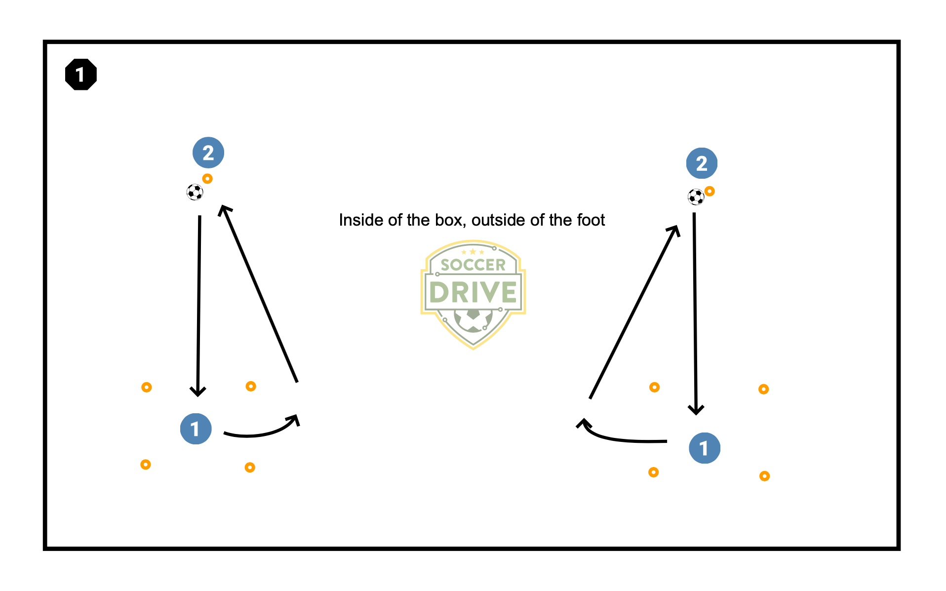 Drill 1: Player 2 will play a drive ball in and player 1 will be starting inside the box and take their first touch with the outside of their right foot, to go through the right side of the box, then their second touch will be a driven ball back to player 2. Player 1 will job back into the box, and immediately receive the next ball to take with their outside of their left foot.