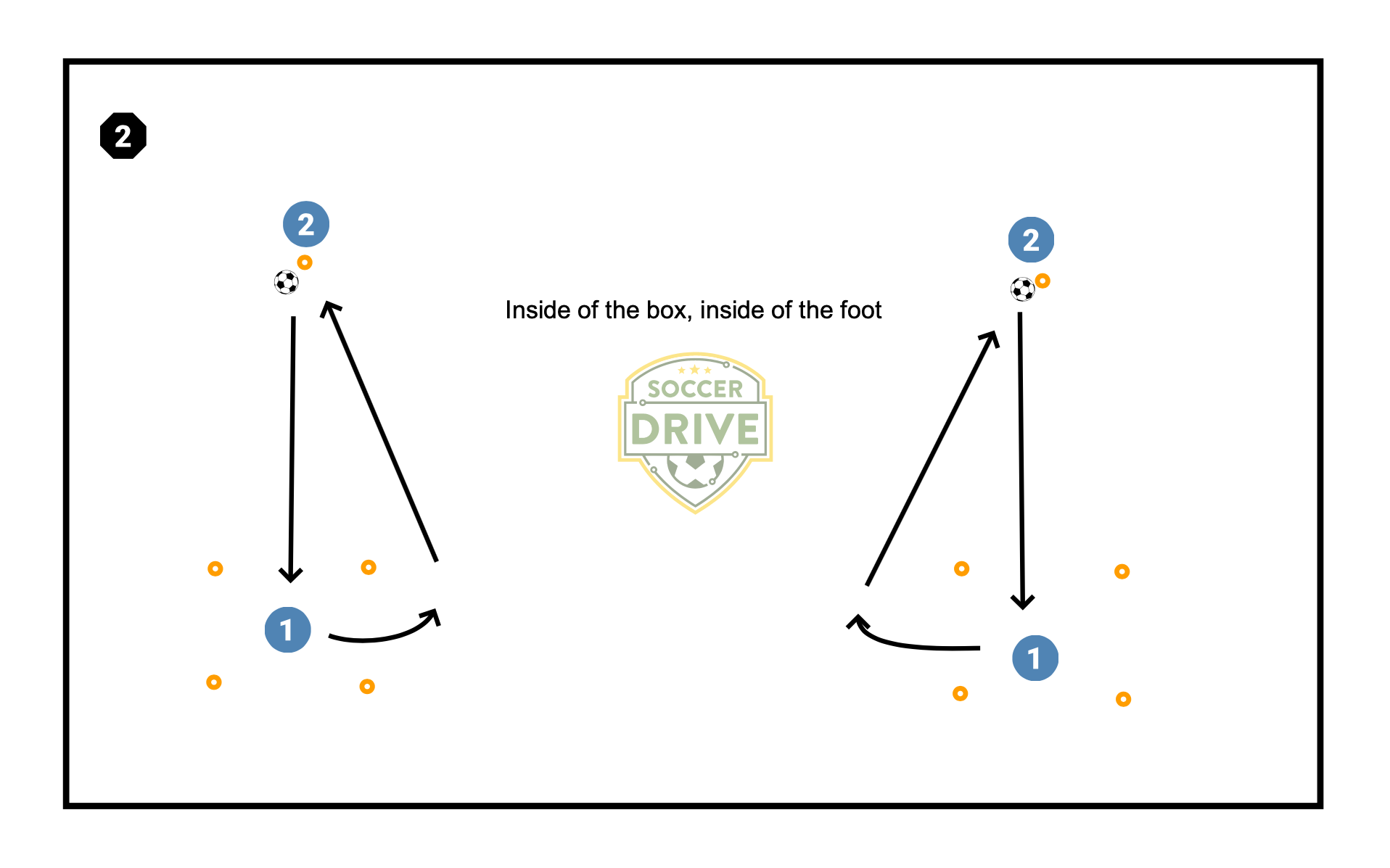 Drill 2: Same as drill 1(starting inside the box), but instead of using the outside of their foot, they will use the inside. Player 1's touch will be with the inside of their left foot, to take the ball across their body and to the right side of the box, to then play the ball to their partner.
