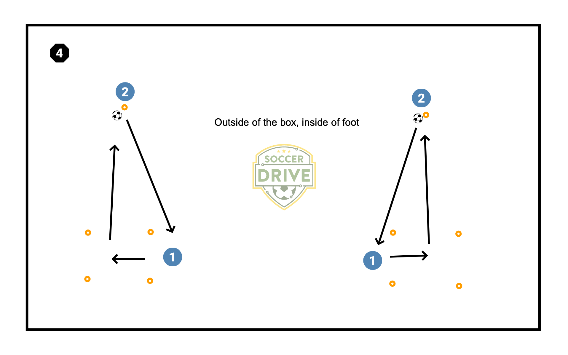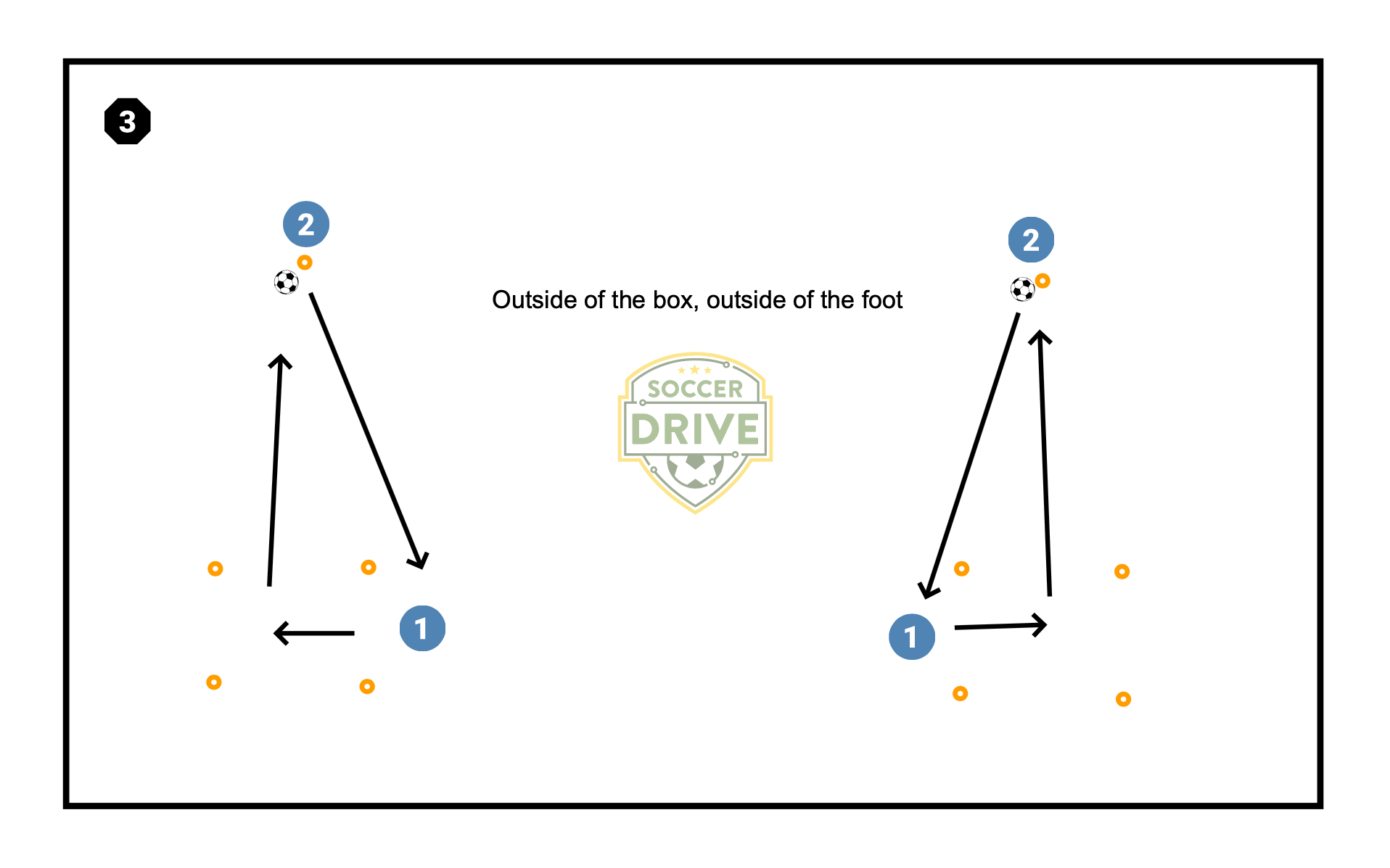 Drill 3: Player 1 will start outside the box on the right side. They will take their first touch with the outside of their left foot to enter inside the box and then their second touch will be played back to player 2. They will then shift to the left side and continue with their right outside foot