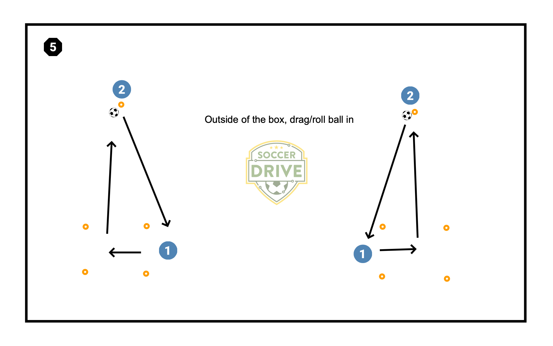 (Slightly more advanced, can build up to it) Drill 5: Player will start on the outside of the right side of the box and drag the ball into the box with their right foot, then jog to outside of the left side, and drag with left foot