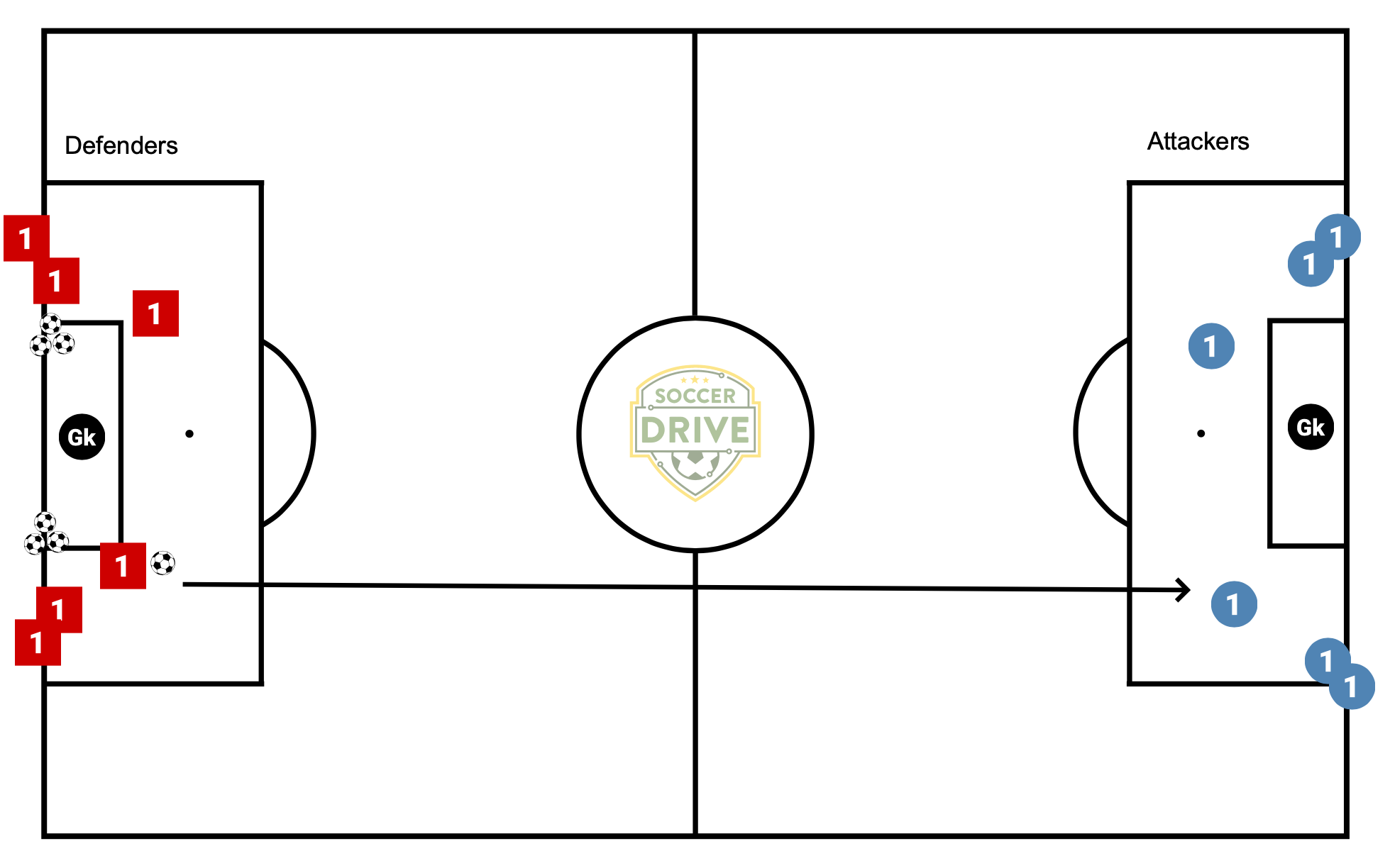 Defenders will play the ball into the attackers and go into a 2v2. Defenders are looking to close down the space as quickly as possible and not allow a shot