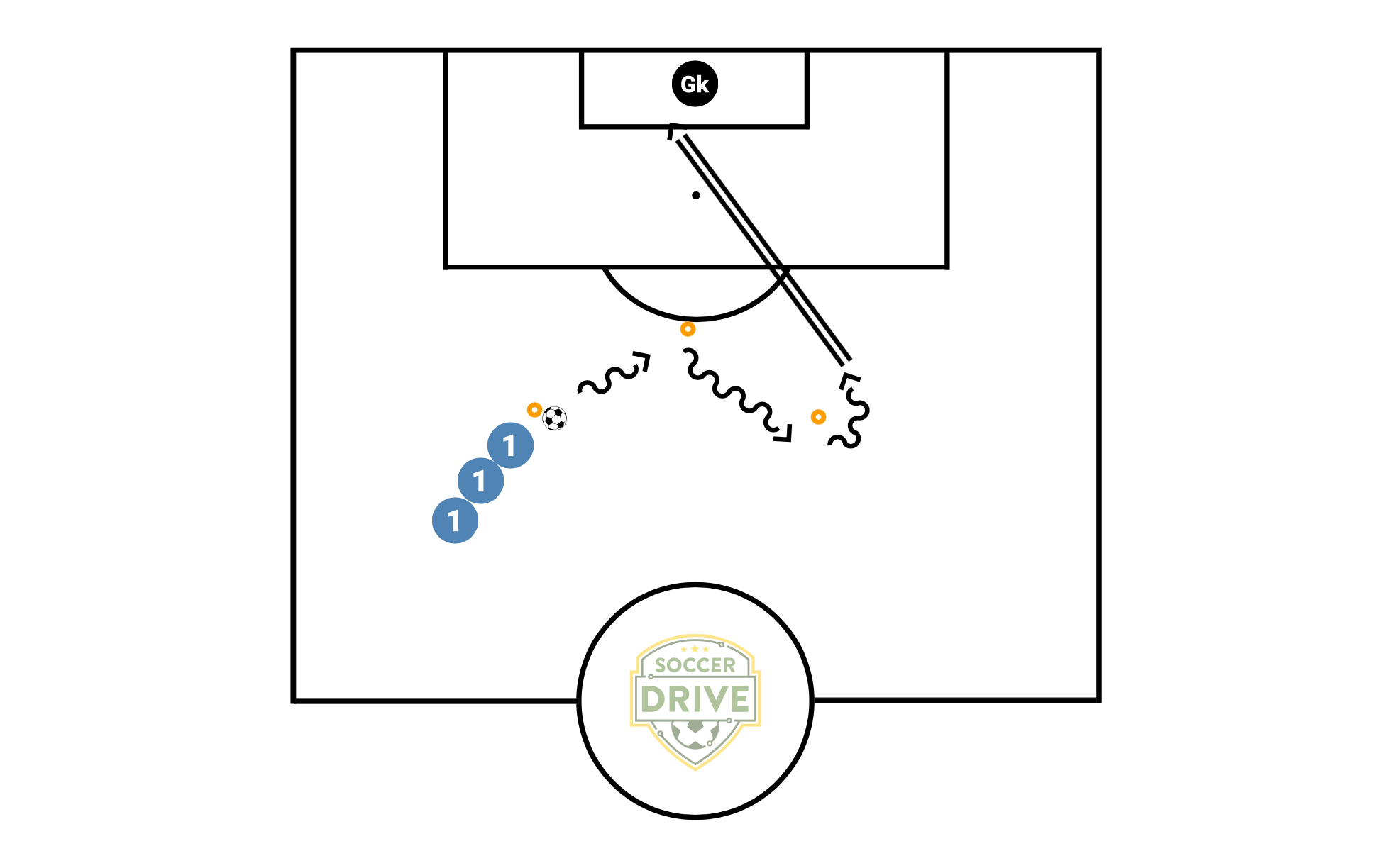 Start with players on left cone with a ball. First player speed dribbles to middle cone, cuts, speed drills back to the third cone, quick turn and shot.