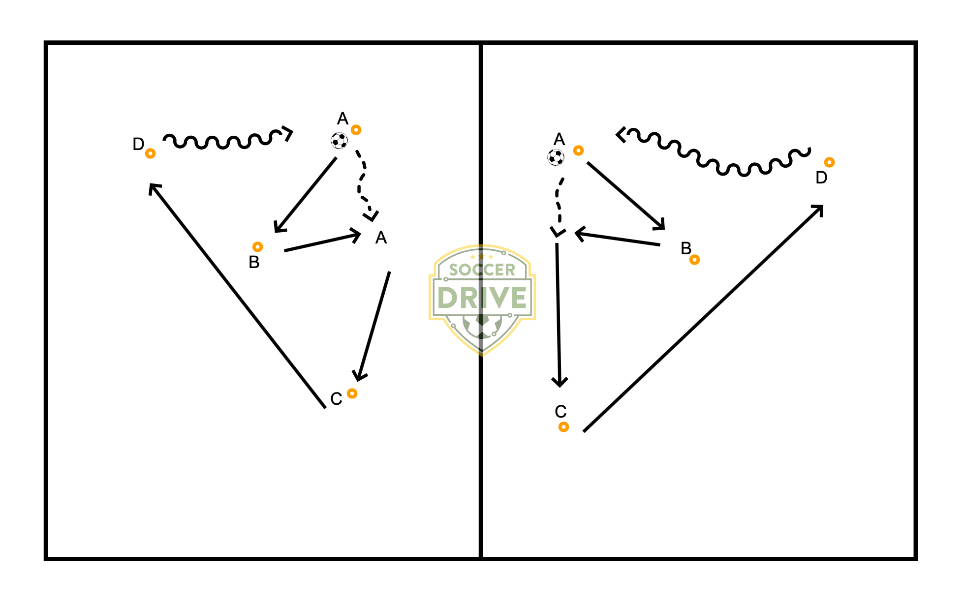 A passes to B, who lays it off to A. C check s out to receive a pass from A, takes a touch wide to play D, and D dribbles back to the start