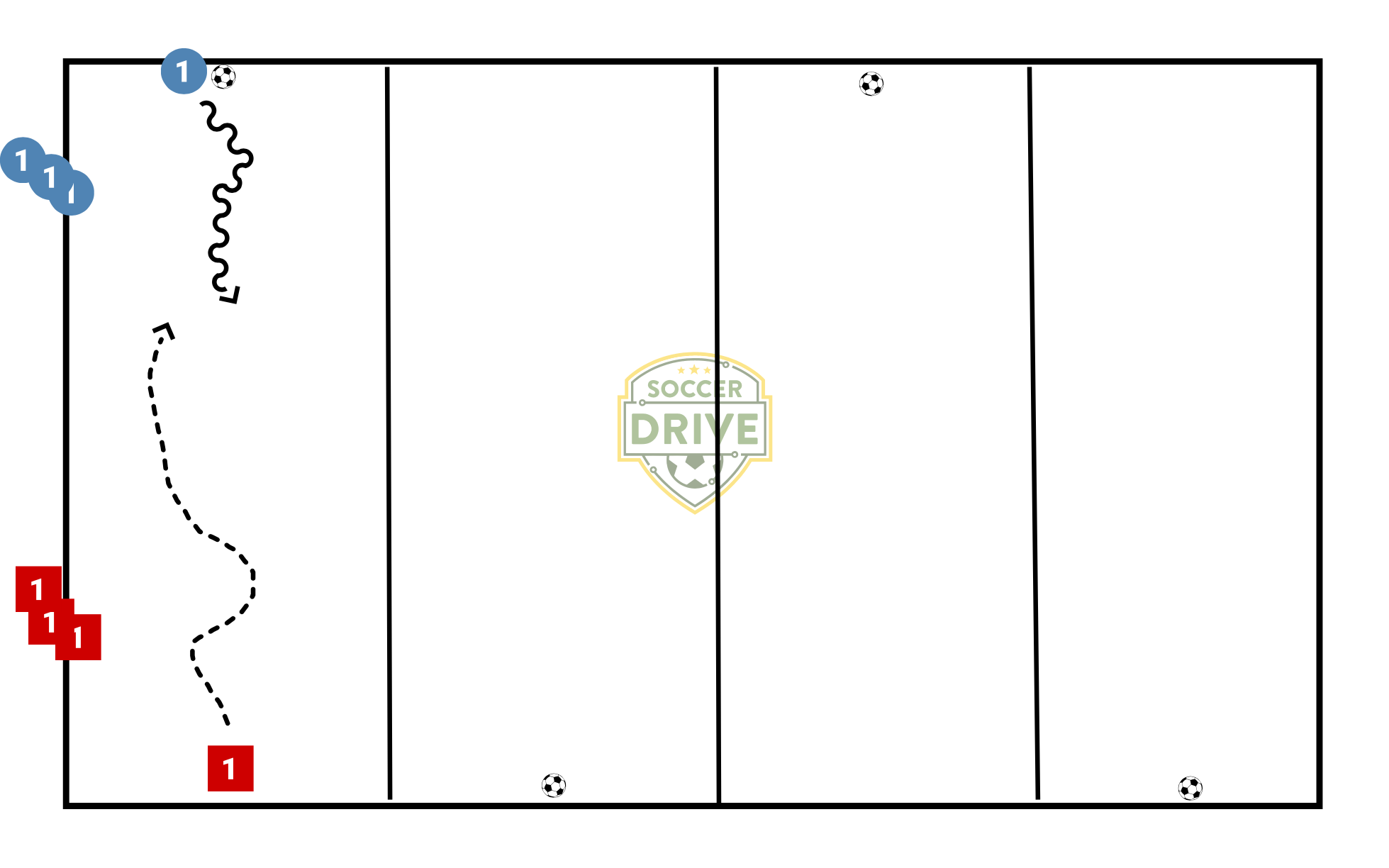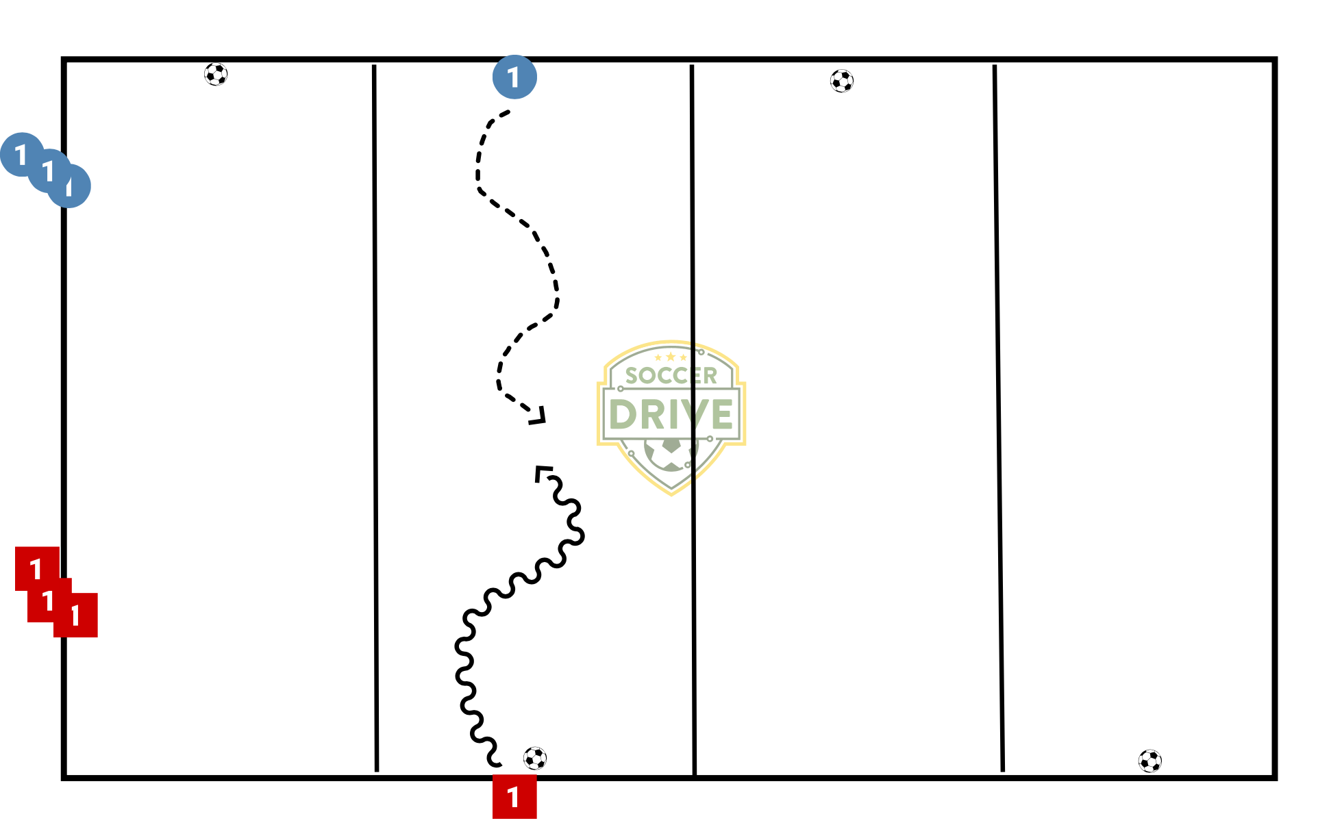 Create 4 5-10 yard boxes/grids, with 2 lines on opposite sides. There should be a ball on the opposite side, diagonally from one another. The blue player will run up to the first ball and speed drill to the middle, while at the same time the red player will quickly close down the space, forcing the player one direction. It is important the players get in an athletic stance when breaking down, staying on their toes, side-on, and as they approach the ball, then slightly back off to avoid diving in/getting beat. After the break down, both plays will job back to the line (blue player brings the ball back to line), and red then dribbles the ball in while blue breaks down the play.