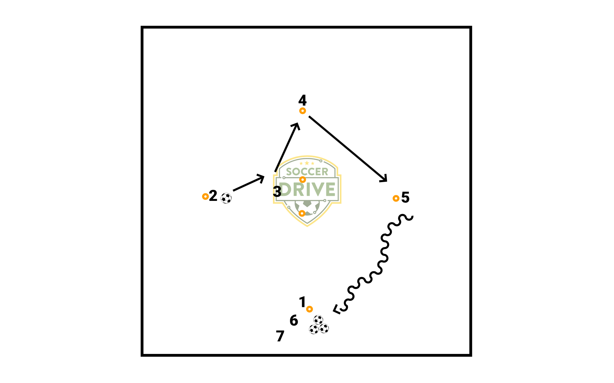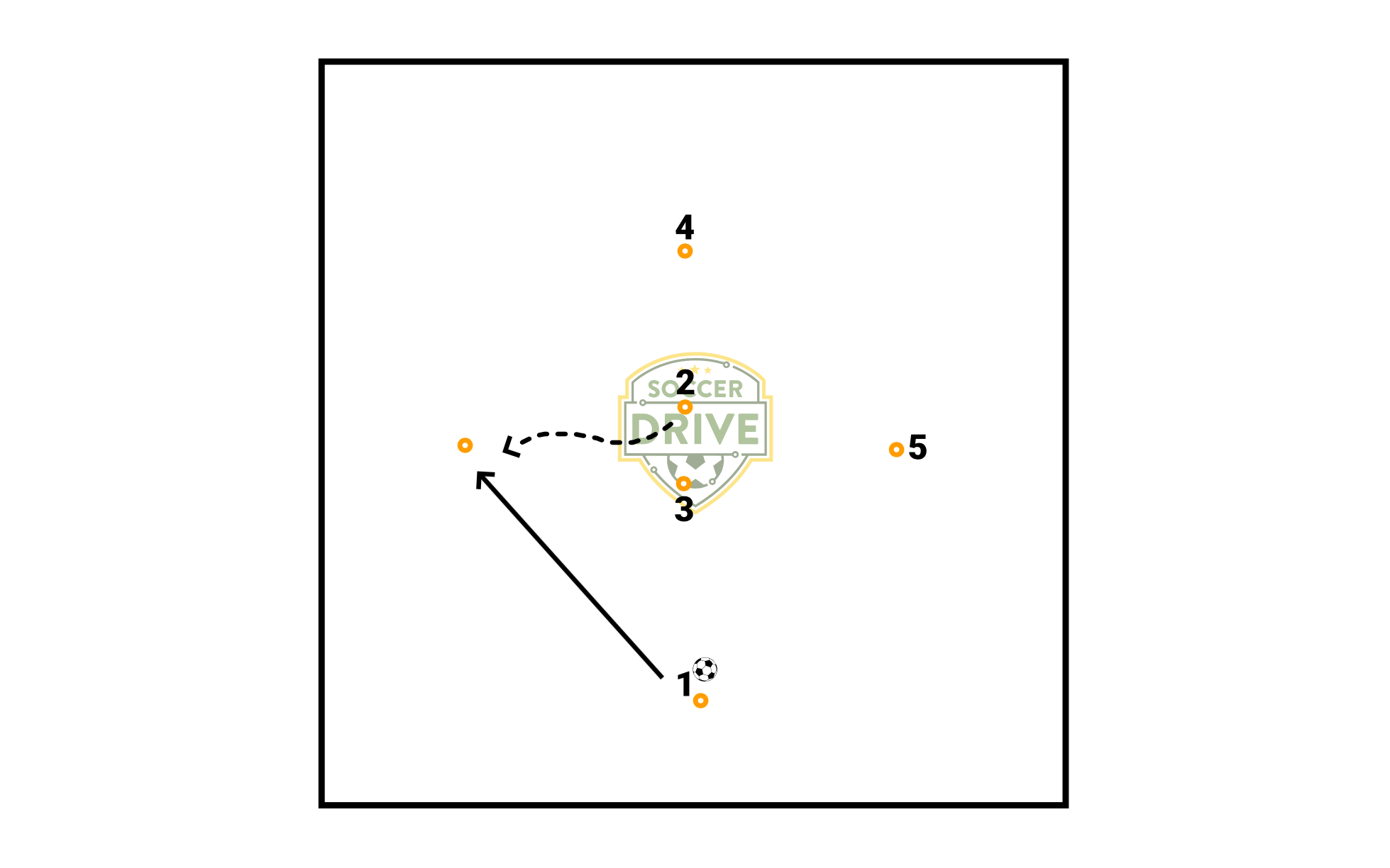 1 starts with the ball 2 checks to the outside cone, and receives a pass from 1 2 then passes to 3, who then plays down to 4 4 plays 5 and 5 dribbles back to the start Players will follow their pass