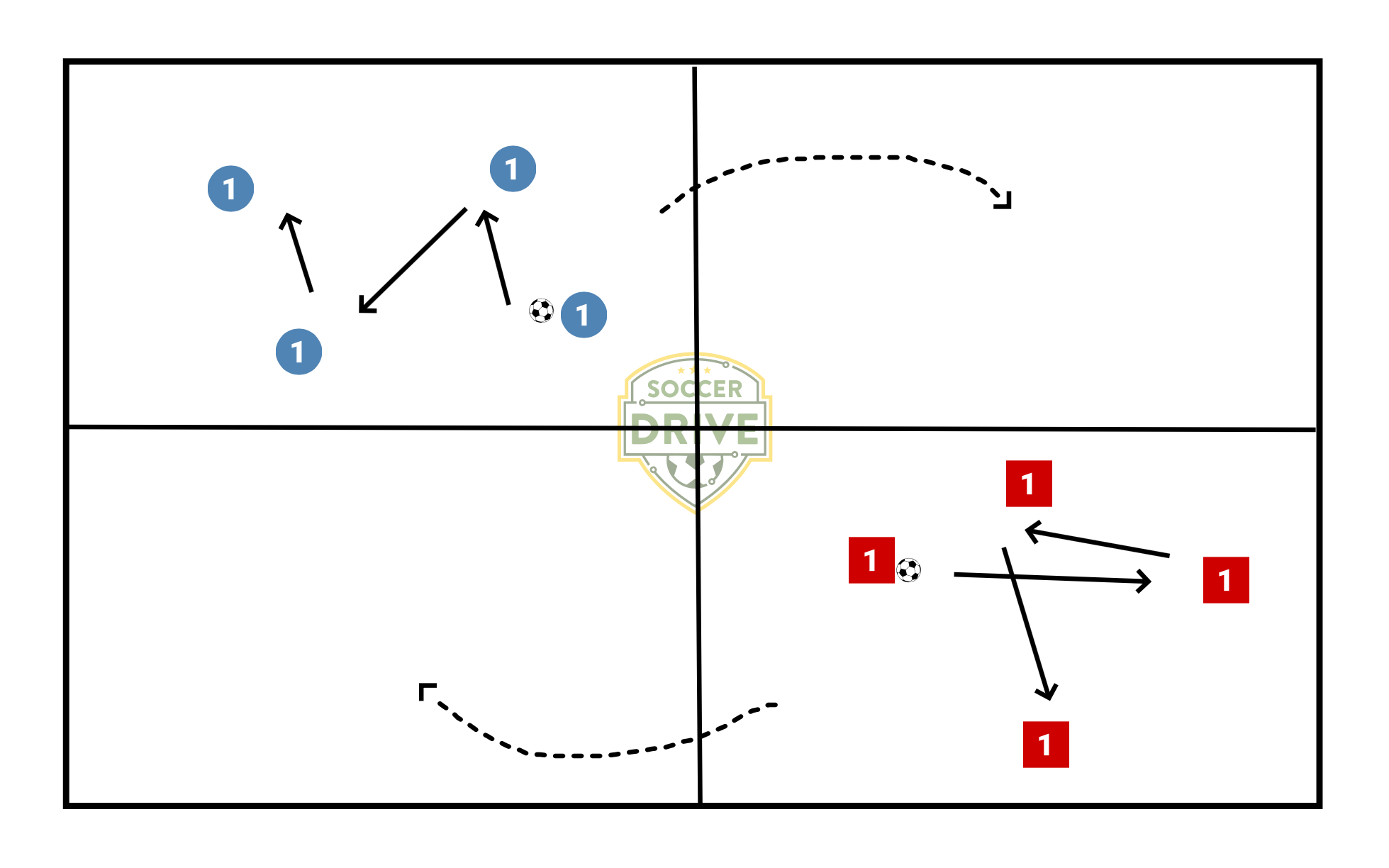 Progression 1: move to 1 touch only Progression 2: Add 1-2 defenders