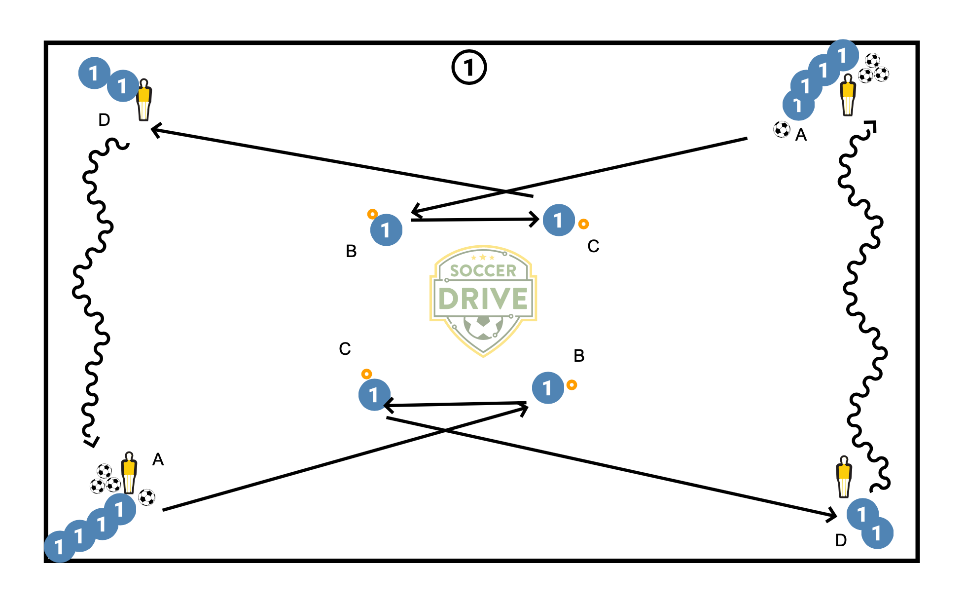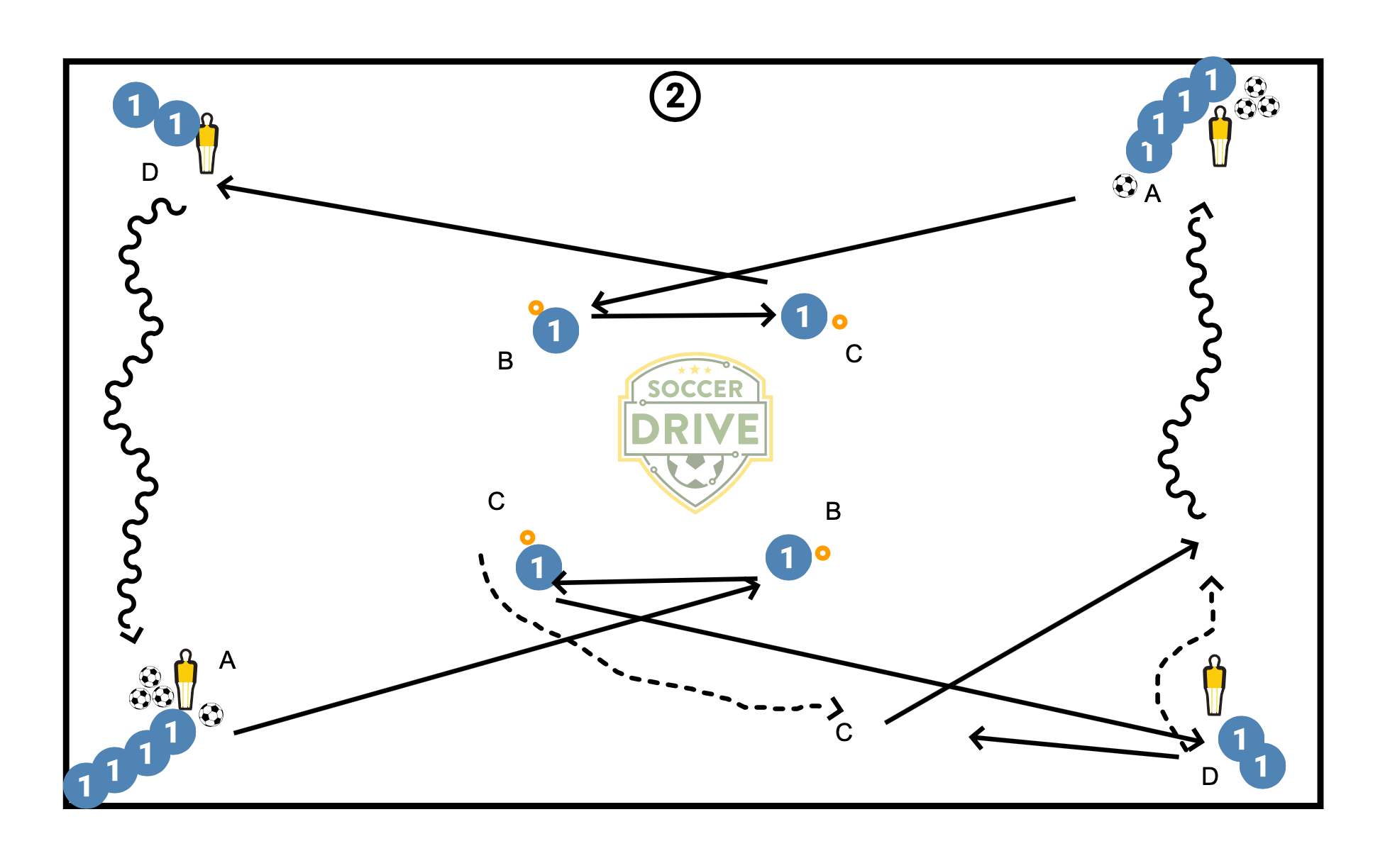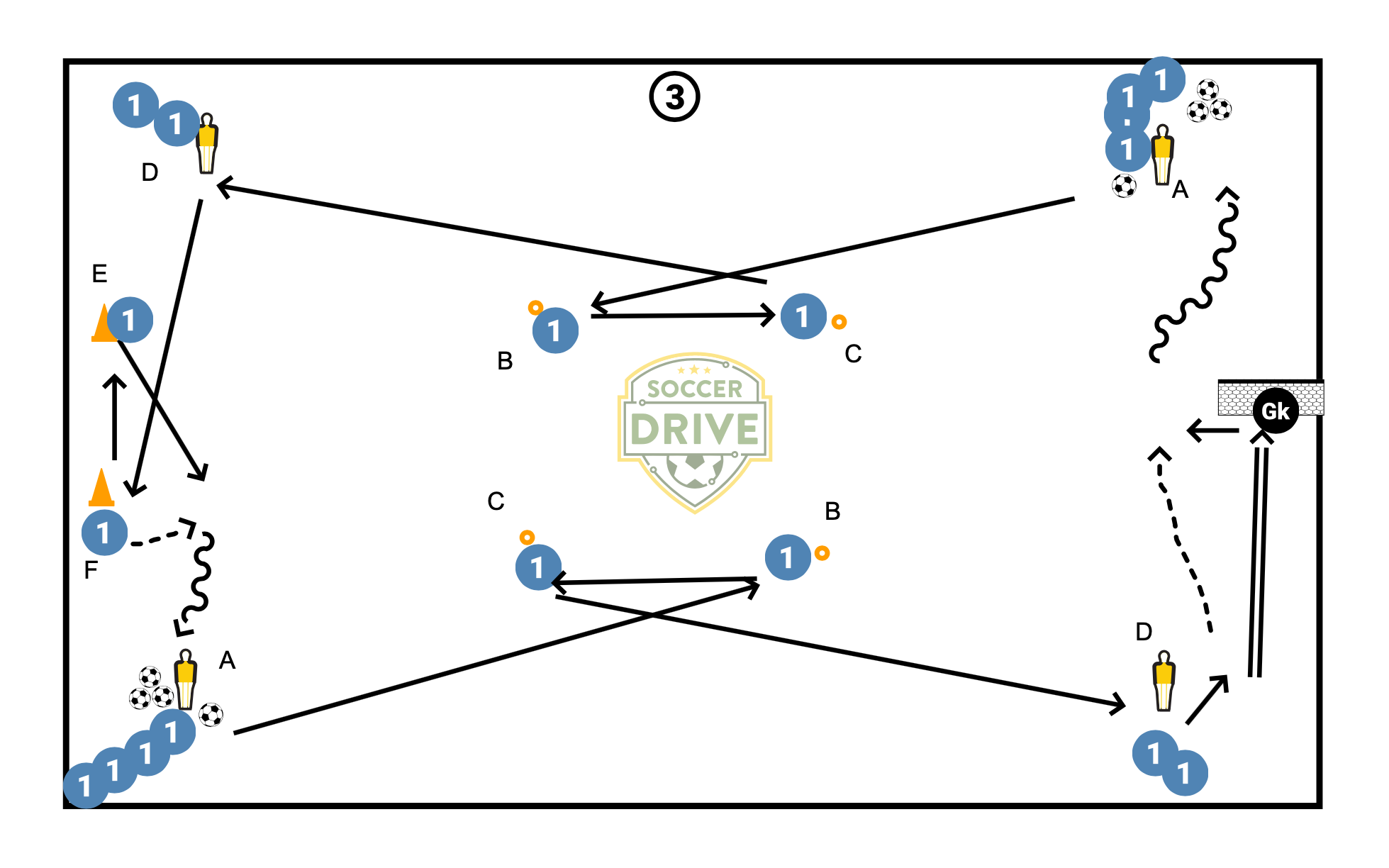 Set up the outer square about 25-30 yards, and the inner square about 10 yards. Players will start at two diagonal corners (about 4 per line), with balls. Sequence 1: Two diagonal players start simultaneously (A) with a sharp diagonal pass to B, B plays C, C plays D, and D dribbles to the other side. Players follow their pass. Encourage 1-2 touch Sequence 2: Same as above but adding in a wall pass with C and D - C will play D, who lays if off to C who is checking in, and then lays it off to D who is making the run down the line (variation: D can pass down the line to next player) Sequence 3: Adding in pug goal/goal. Same as 1 but with a shot, player D retrieves the ball from GK and dribbles down. On the non-goal side, D plays in to F, who lays it off to E while F checks out to receive a ball back from E to run onto and then dribble back to the start.