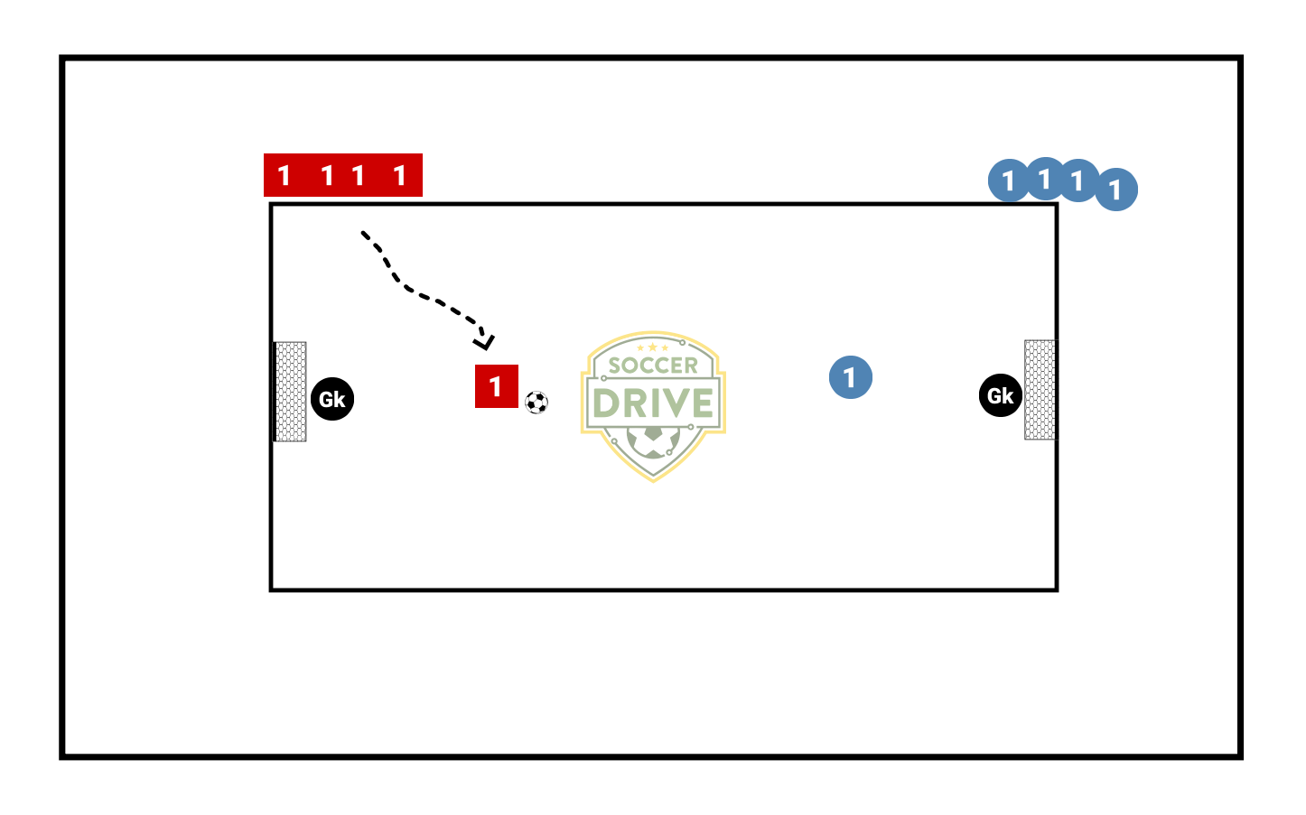 -Starts with the balls on both sides of the goal -1v1: Once red shoots against blue, a new blue player comes out and takes on the red player, defending until the ball in shot/out of play. Should be constant transitioning -Can progress to a 2v2 or 3v3 except all players would switch offÂ