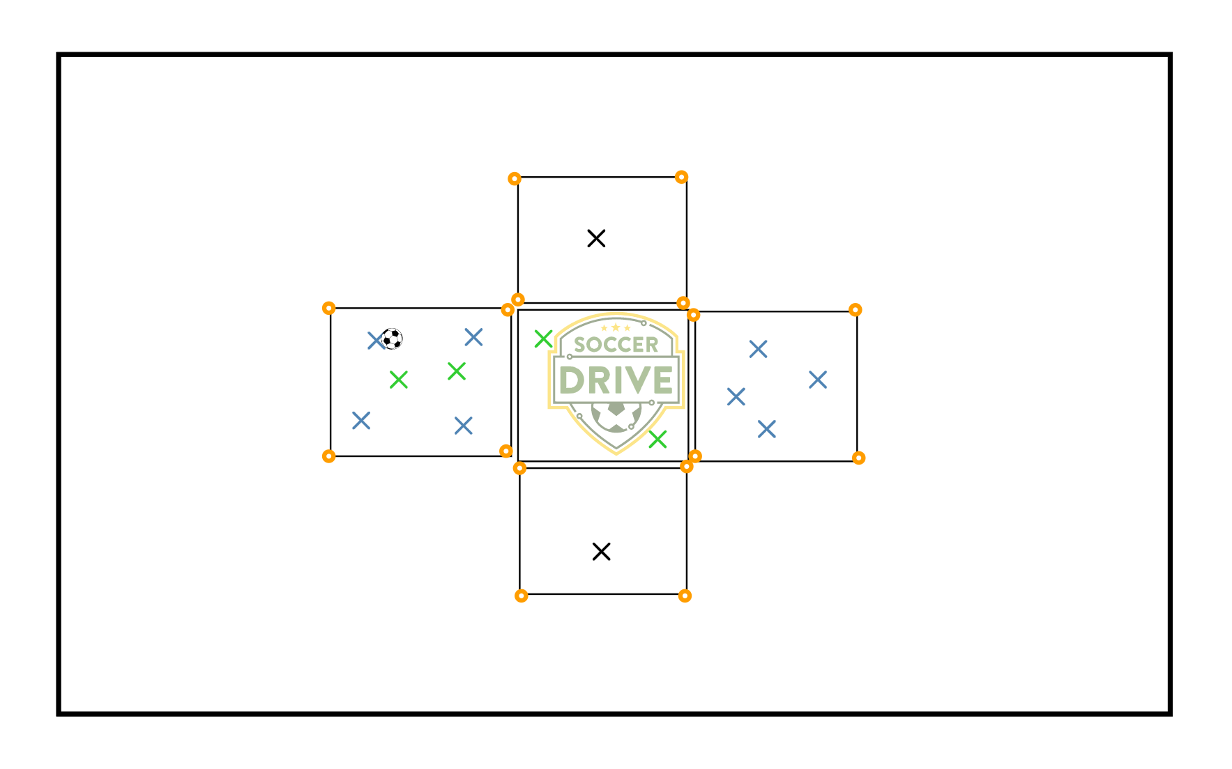 - Blue and black X's are working as a team to transition the ball from one end of the grid to the other.