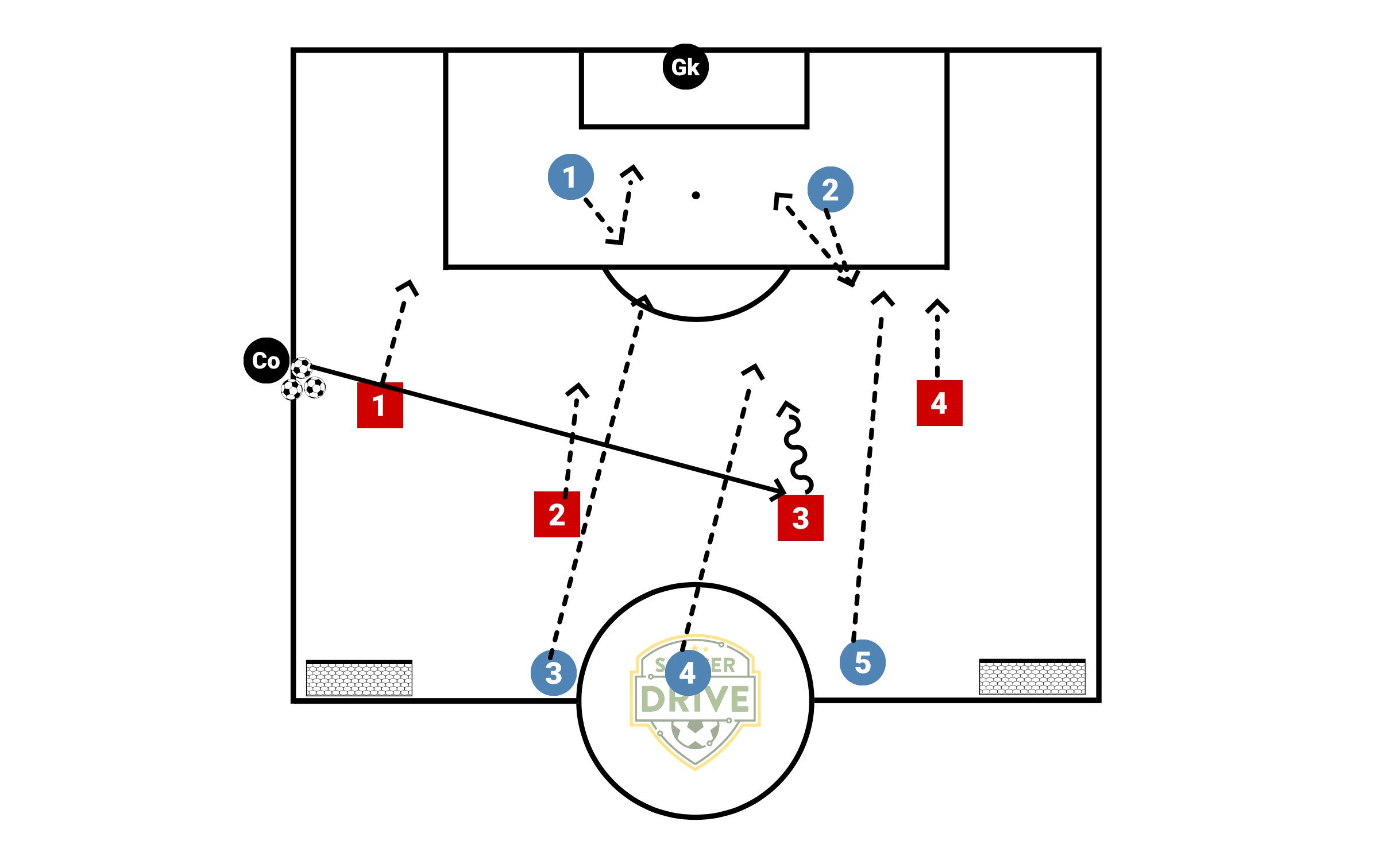 -Think about the same concept as the goal kick press and cover. Somebody should always pressure the ball and other should always cover and support, eliminating opportunities for the attacker to break the press with an easy pass. Once the ball is passed, cover midfielder presses the ball and previous pressure midfielder steps back into cover/support. Always aware of the attackers and the space and lanes they are in and moving toward.
