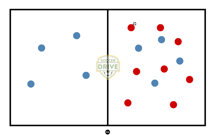 8vs8(possible à 6vs6). Les rouges doivent assurer la possessions. Quand les bleus recupere, ils doivent securiser la possession en transfere le ballon a un de leur 4 bleus. A la tranistion, les 4 bleus traverse et 4 rouge vont essayer de recuperer.