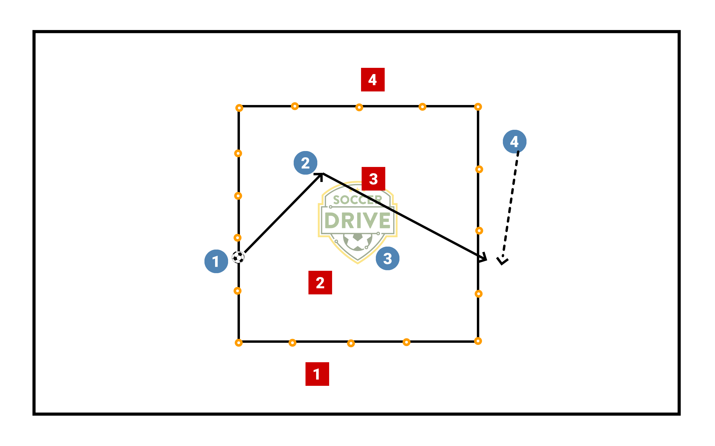 Setup a 15 x 15 box as in the diagram. Two players per team in the box and two on the outside, across each other in a straight line. Other teams sets up the same way. To score a goal, a ball must be played from one outside player, to one inside player, and across to the other outside player. If the other teams gets the ball, they must play to an outside player before attempting to score.