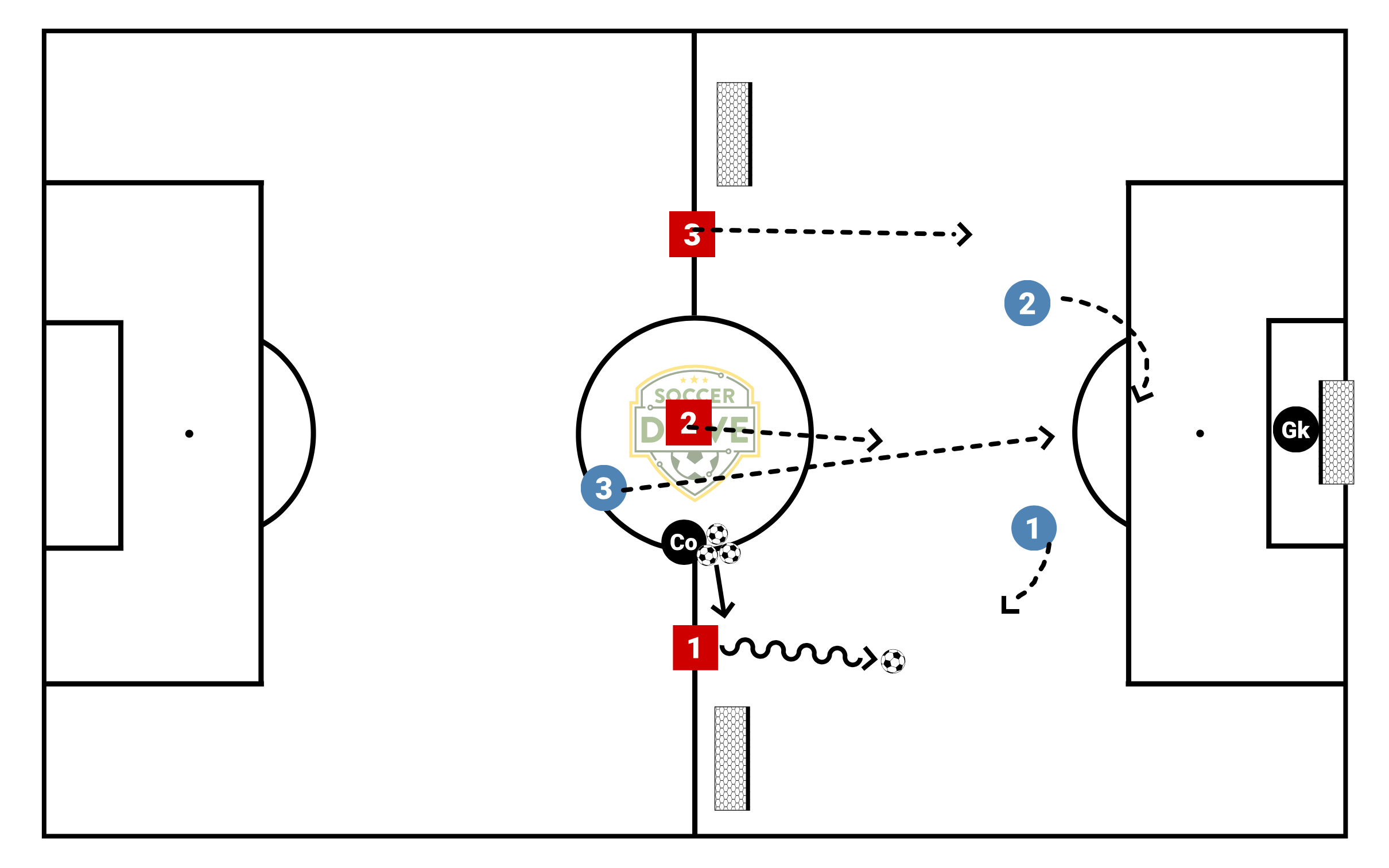 Drill starts with 3 v 2 outnumbered defending. Backs start above 18 and must track back into defensive positions. Back nearest the ball presses the ball, trying to push the ball outside. Other back falls into support between pressing back and screening penetrating defenders. After pass to other attacker, backs switch roles as supporting back now presses and other back falls into support and screen role. Attackers attempt to score on goalie. Backs attempt to win back possession and score on small goals. 5 reps in a row for each fullback tandem, no recovery time. Attackers switch each time. Switch backs out after 5 reps.