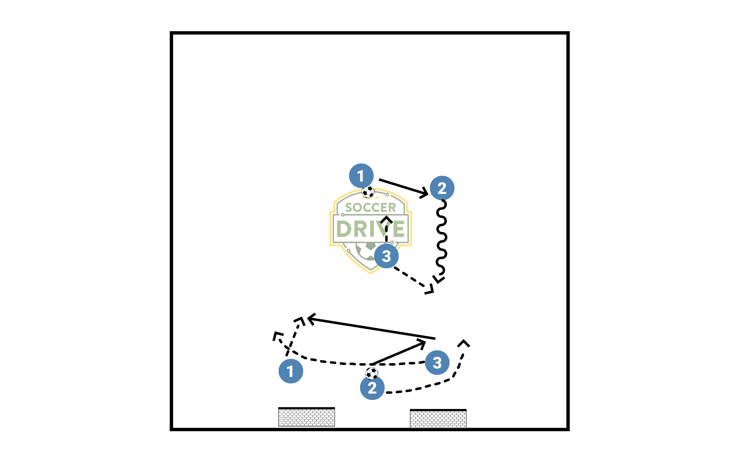 Three players start at end line. Middle player passes ball in front of side player and follows the pass. Receiving player passes to this player and follows that pass. Players continue this passing pattern up the field until they reach the end line. Last player with the ball stops the ball in the middle and drops into defense. Other 2 play 2 v1 to goal on the way back.