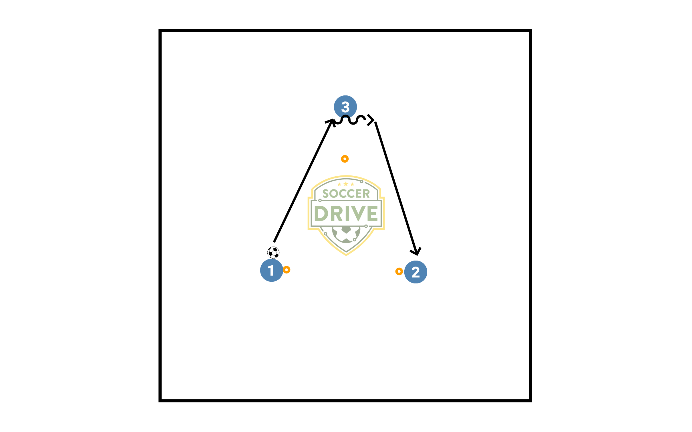 Simple passing and purposeful first touch drill. Player 1 passes to outside foot of player 3. Player 3 is trying to play to player 2, so he must play that first touch from his right foot to the left side and then a crisp left foot pass to player 2. Player 2 plays the ball to player 3's left foot, whose first touch should be to the right for a crisp pass back to 1. Play 10 balls, all the way through, and then switch.