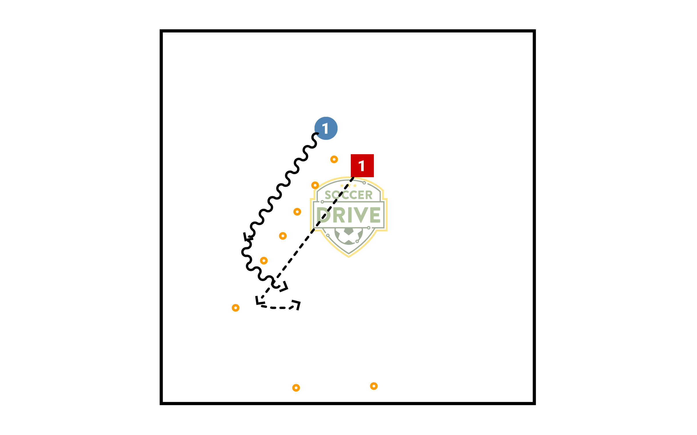 Blue Player 1 with ball dribbles on diagonal along cones. Red player shuffles along, keeping blue player outside and delaying. Blue player makes move into last opening and red player moves to press and take the ball away. The red player's mindset should be delay, delay, delay (keep blue moving away from the goal)...PRESS!! as soon as blue makes his move toward the goal. Switch roles, then bring another group in.