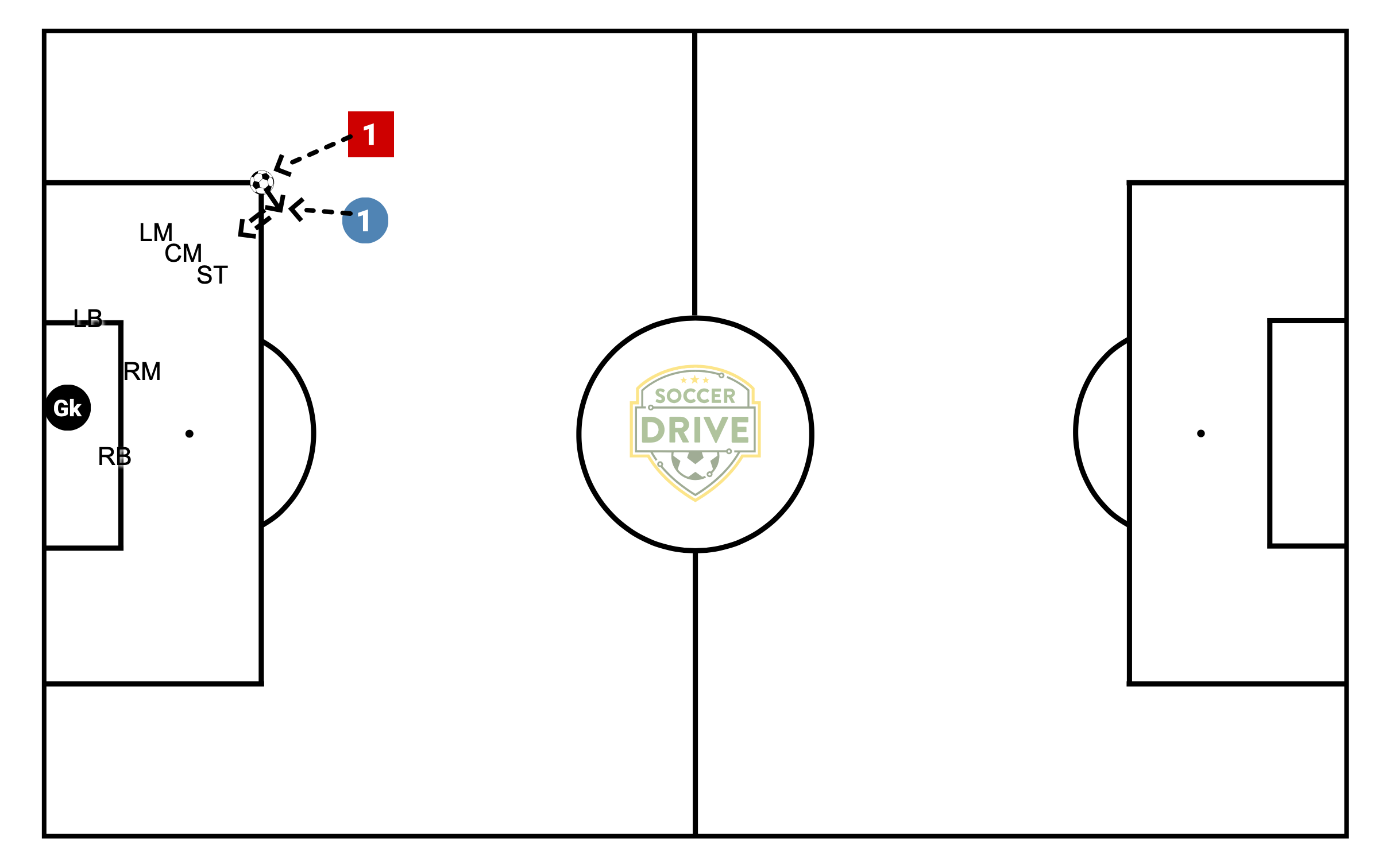 Partner up. Work on turning indirect kicks into free kicks. Both players look like they are going to take the kick. First one runs up and lightly taps the ball sideways into path of second player who runs up to shoot on goal. Alternate players.