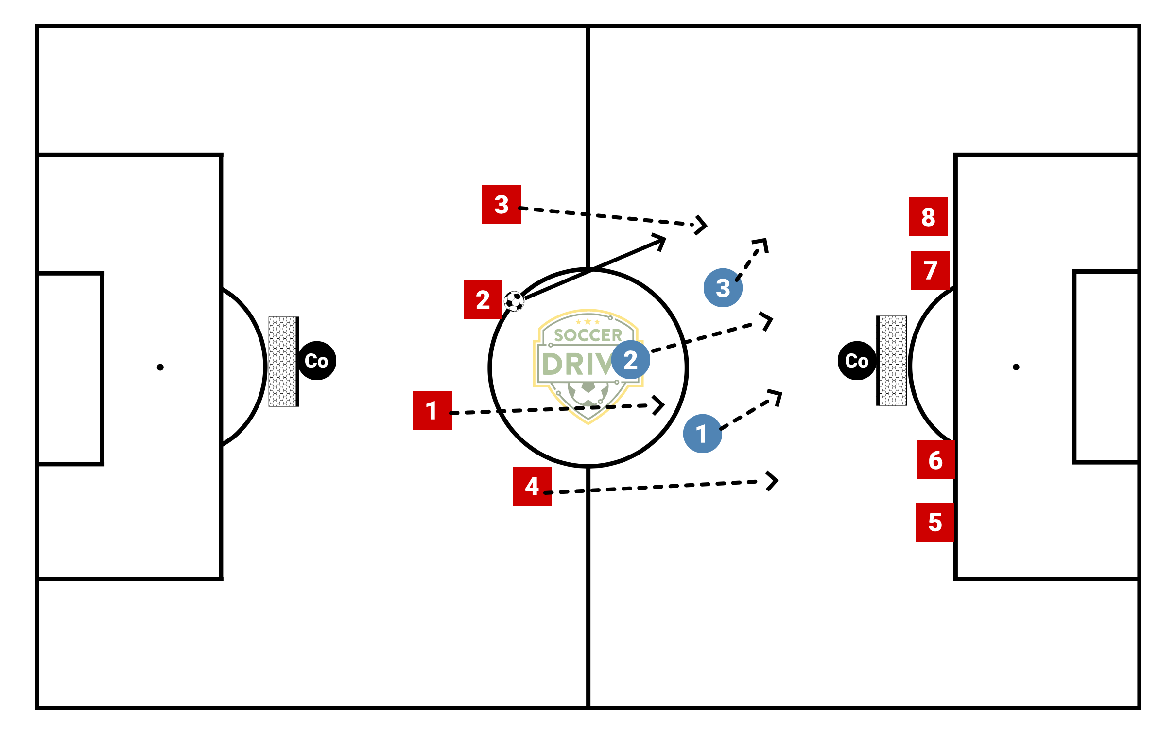 Shorten the field, keep real goals with coaches in as goalies. 4 attackers attempt to score on 3 defenders. Defenders must press and cover and communicate to win back the ball or simply clear it. When attackers score, they get a point. When defenders repossess or clear, they get a point. As soon as point is done, defenders sprint back to "midfield" and setup. They should play high to shorten the field and fall back as necessary. Attackers on other side play ball in and come at the defenders. Same game, keep switching sides of attack.