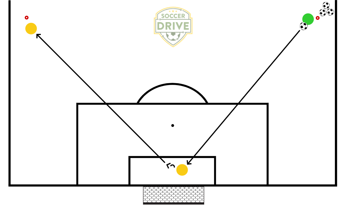 One goalkeeper in the goal, one goalkeeper near the sideline, and a trainer or third goalkeeper with balls on other sideline. Balls get played in from the sideline, high or low, towards the goalkeeper in the goal area. After the catch, the goalkeeper opens up distributes the ball to the goalkeeper (teammate) on the other side line. Goalkeepers switch position after certain amount of actions. Instead of a goalkeeper use a small goal to distribute the ball into. The goalkeeper could also punt or (side) volley the ball to targets higher up the field. Work from both sides of the goal.