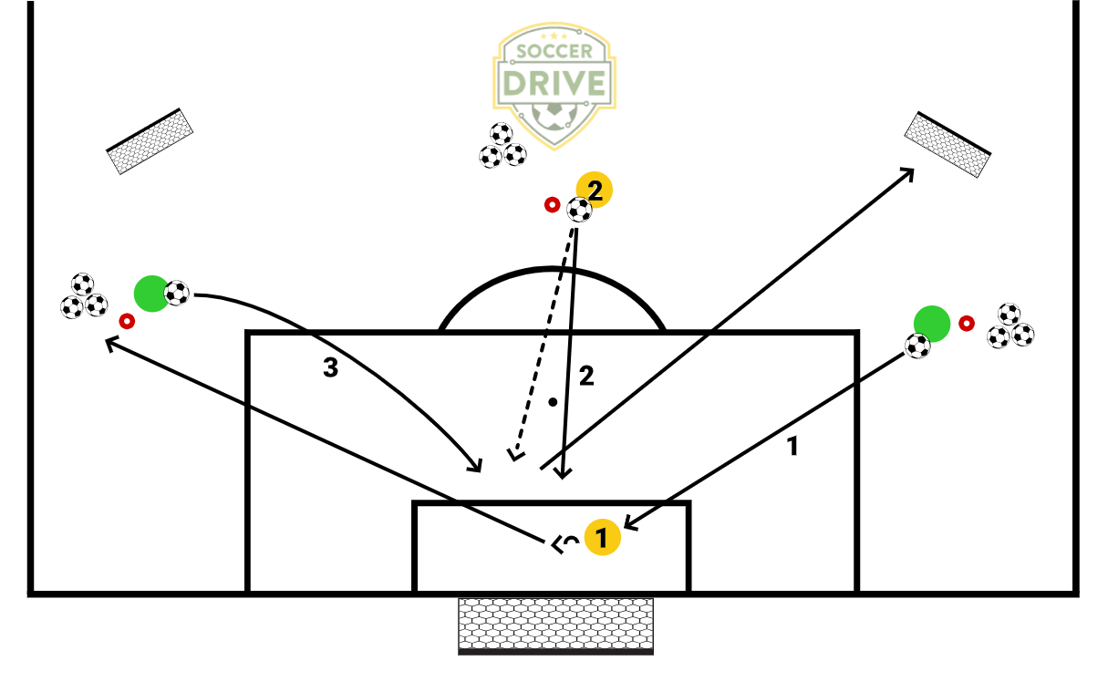 Place two smaller goals towards the left and right side line outside of the penalty box. One goalkeeper in the goal, one goalkeeper/trainer on left side and right side of the penalty box, and one trainer/goalkeeper on the top of the penalty box. Soccer balls at all three positions. Goalkeeper 1 asks for and receives a back pass from on side, opens up and passes the ball to the trainer/goalkeeper on the other side. The goalkeeper gets back into the center of the goal to deal with the shot and rolls the ball back to the shooter. The goalkeeper quickly gets into the correct position to deal with the cross and distributes into one of the two small goals. Goalkeepers switch position after certain amount of actions. Work from both sides of the goal.